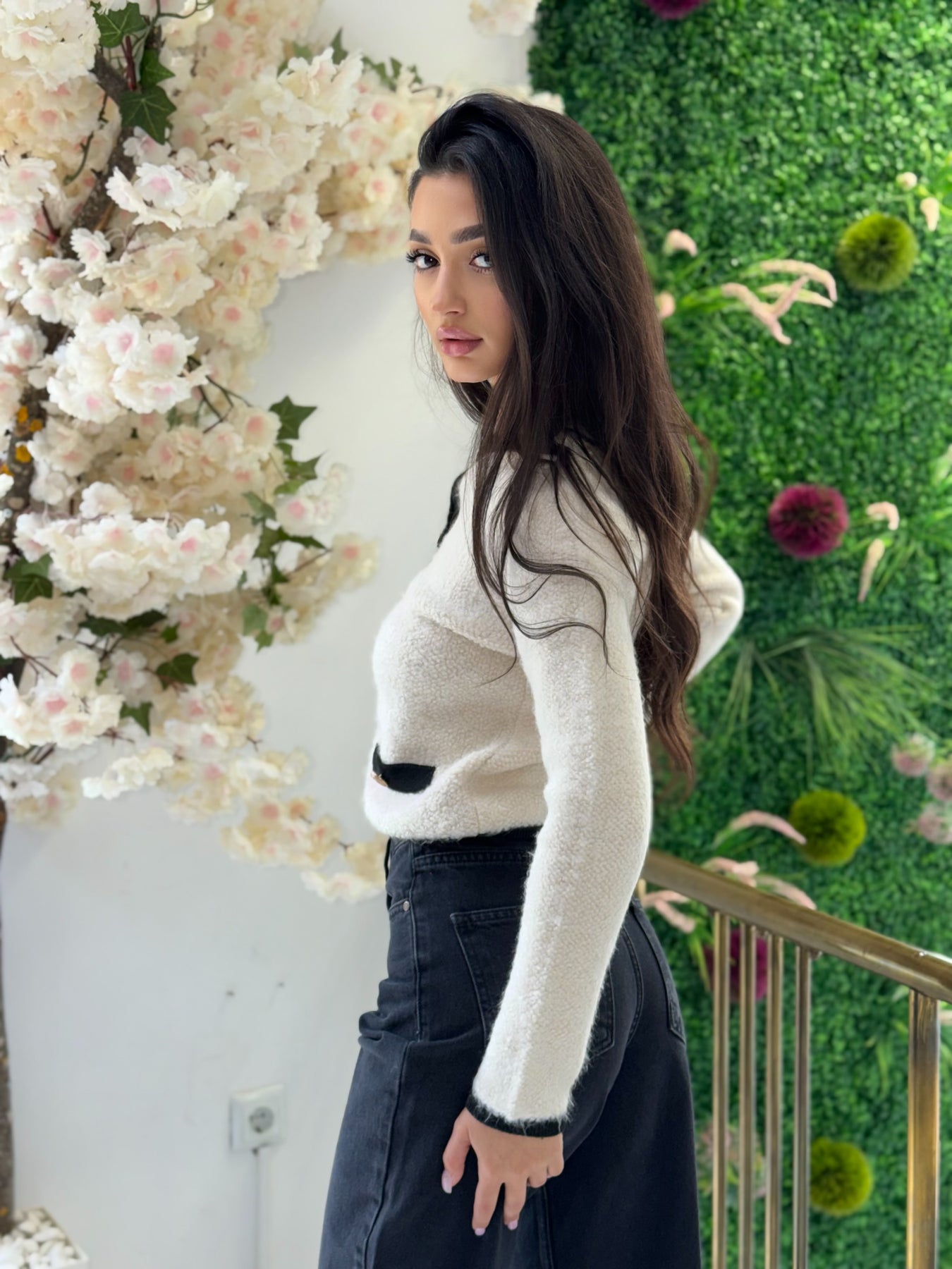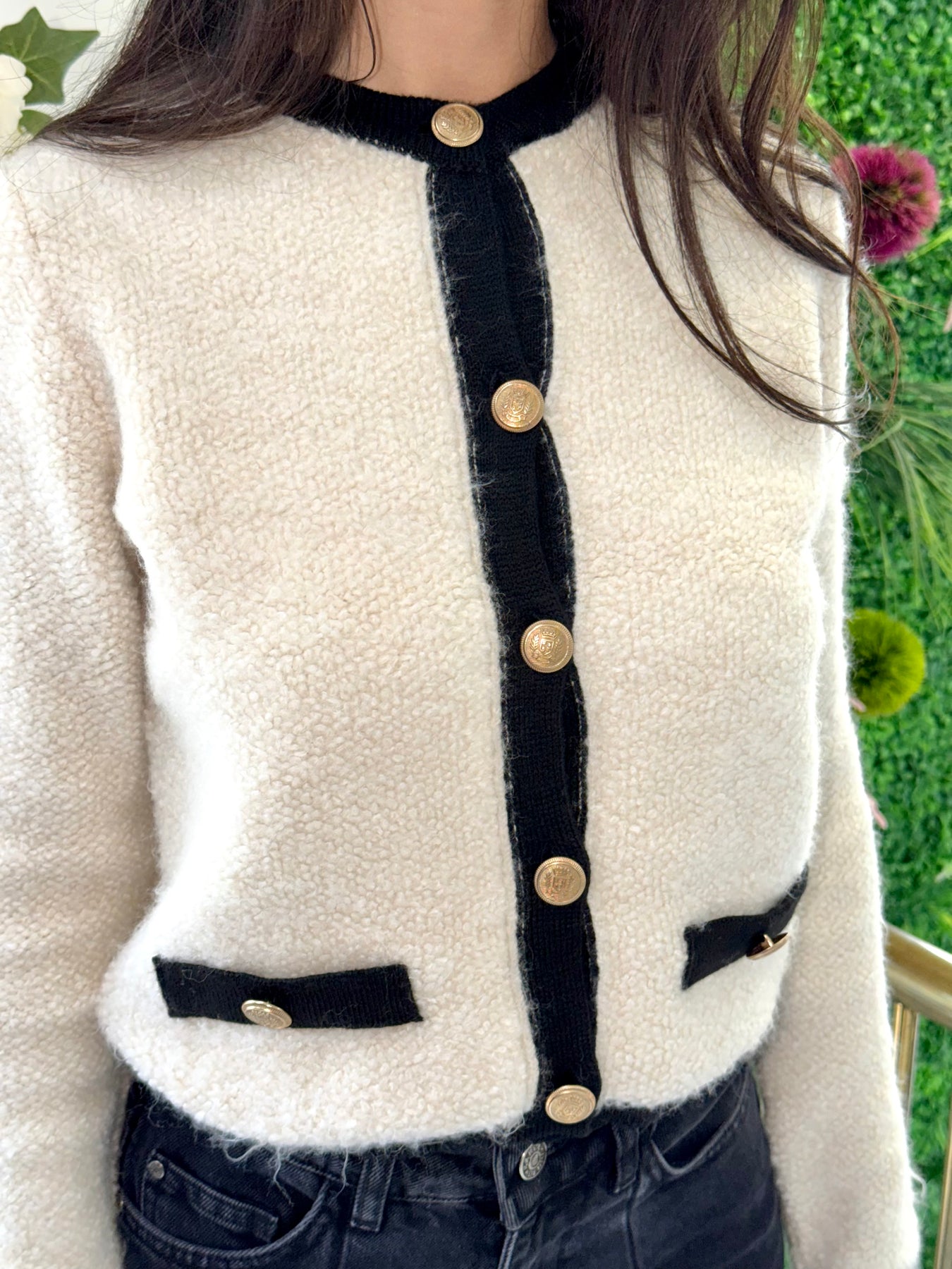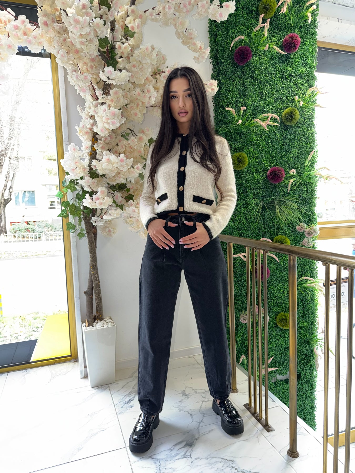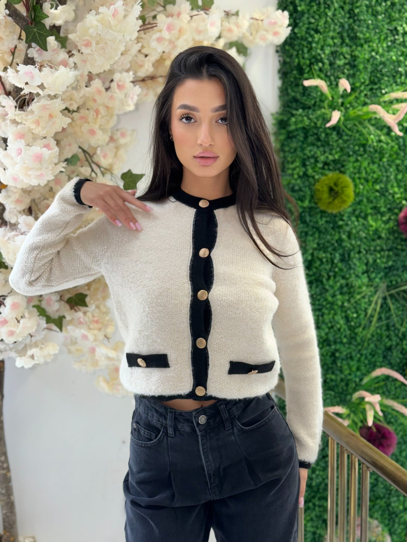 Елегантна и нежна визия с модерно излъчване – тази жилетка е перфектният избор за жени, които обичат класиката с актуален прочит. Контрастните черни кантове и златистите копчета придават изисканост, а меката текстура прави модела изключително комфортен за целодневно носене.