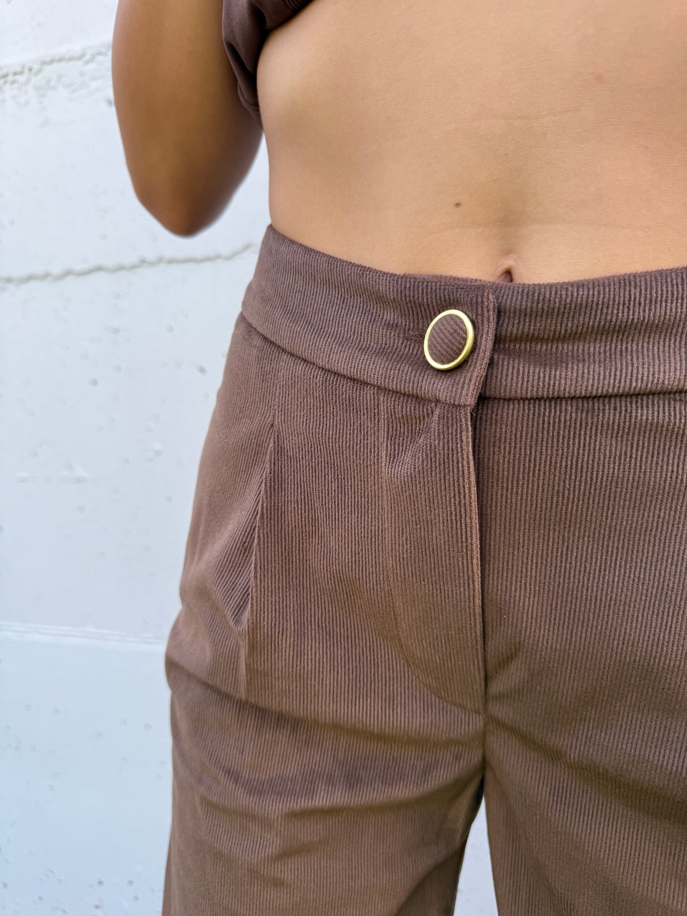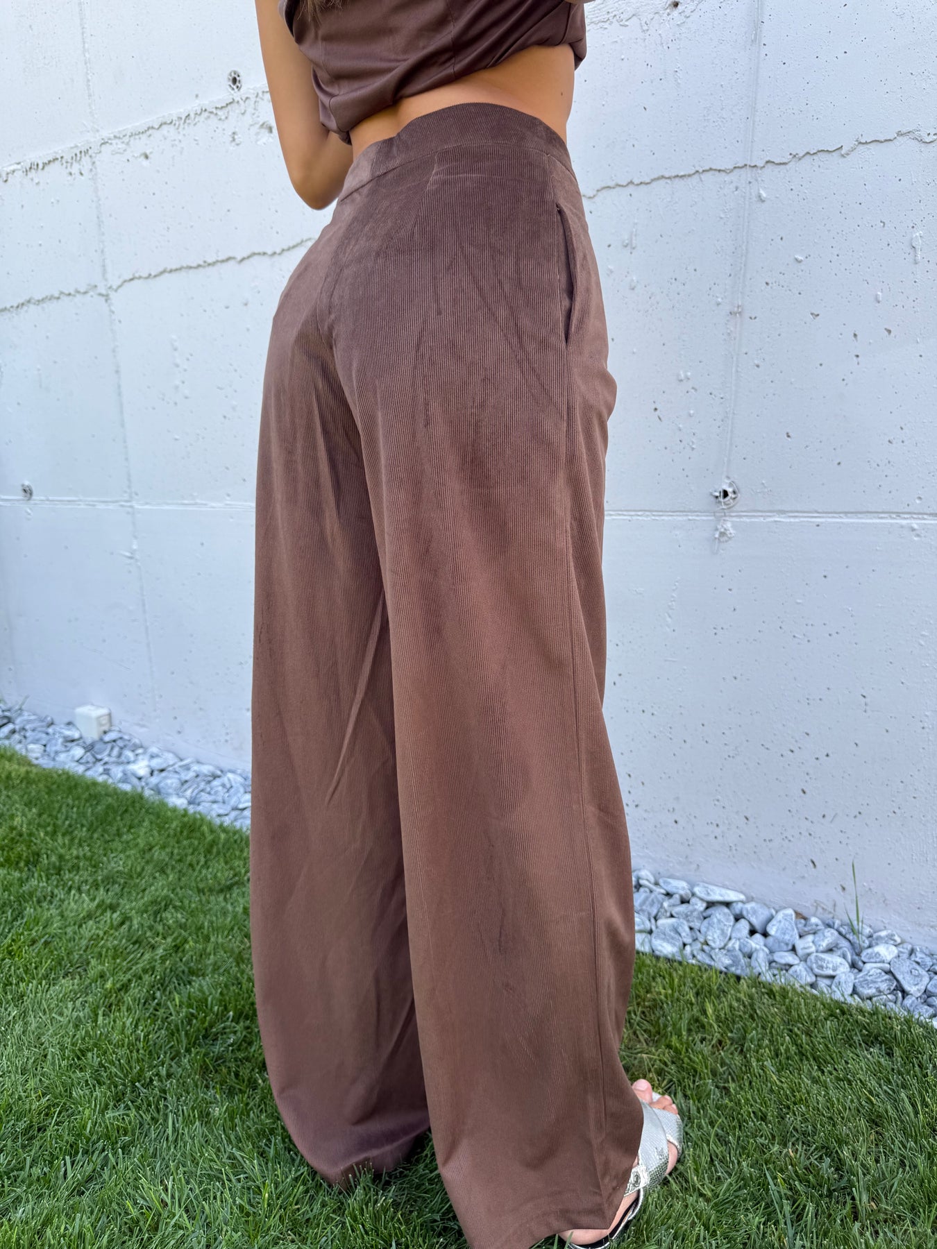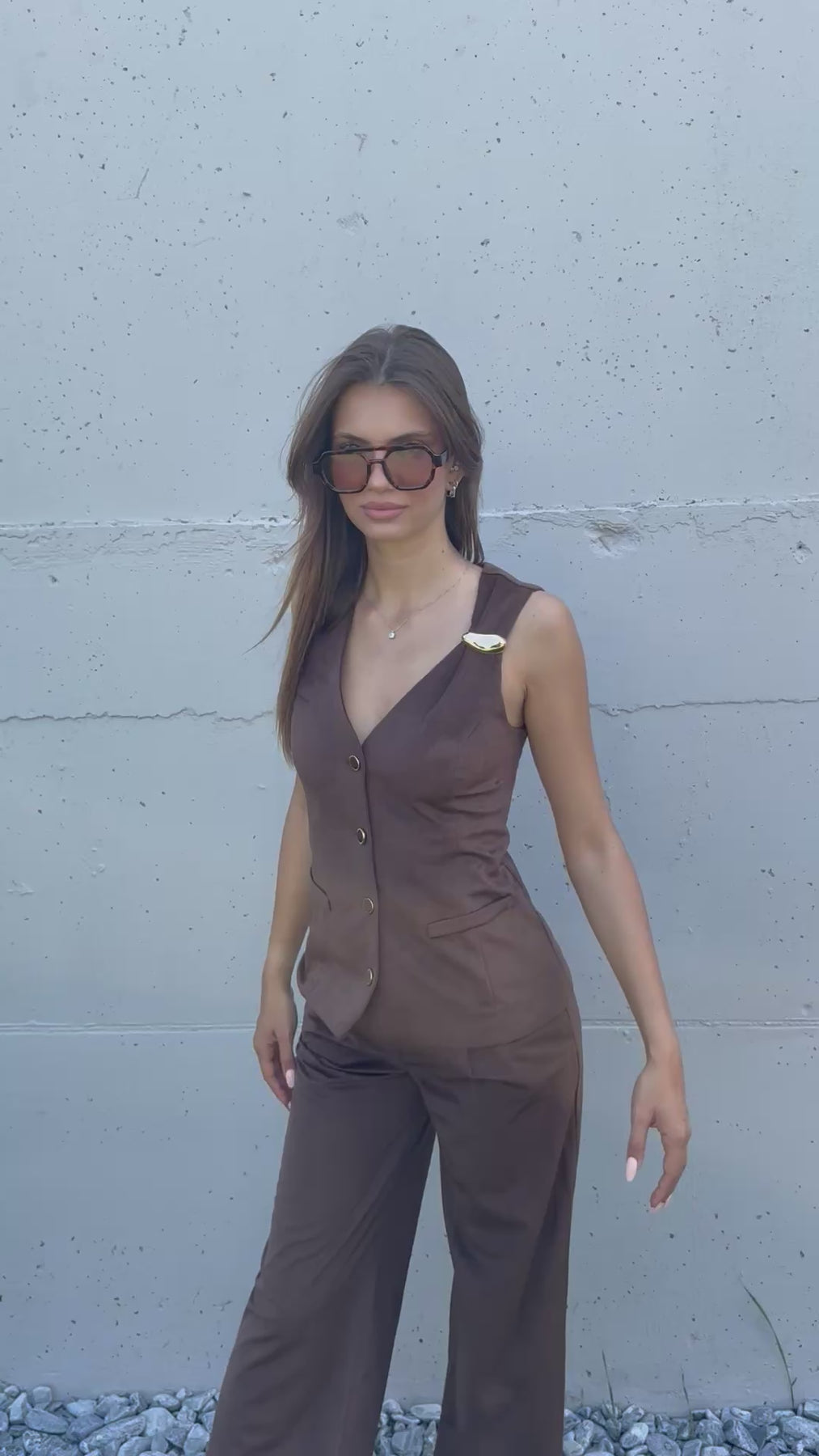 Този елегантен кафяв комплект е създаден за жената, която обича минимализма и модерната класика. Състои се от втален елек с копчета и прав панталон с висока талия, които подчертават фигурата и придават изчистена, но впечатляваща визия. Цветът на този комплект носи усещане за лекота и стил, а свободната кройка на панталона гарантира удобство през целия ден.