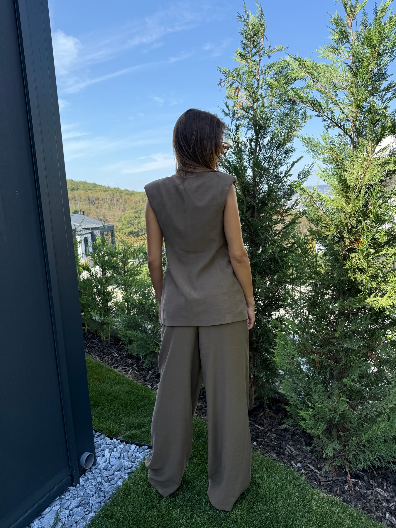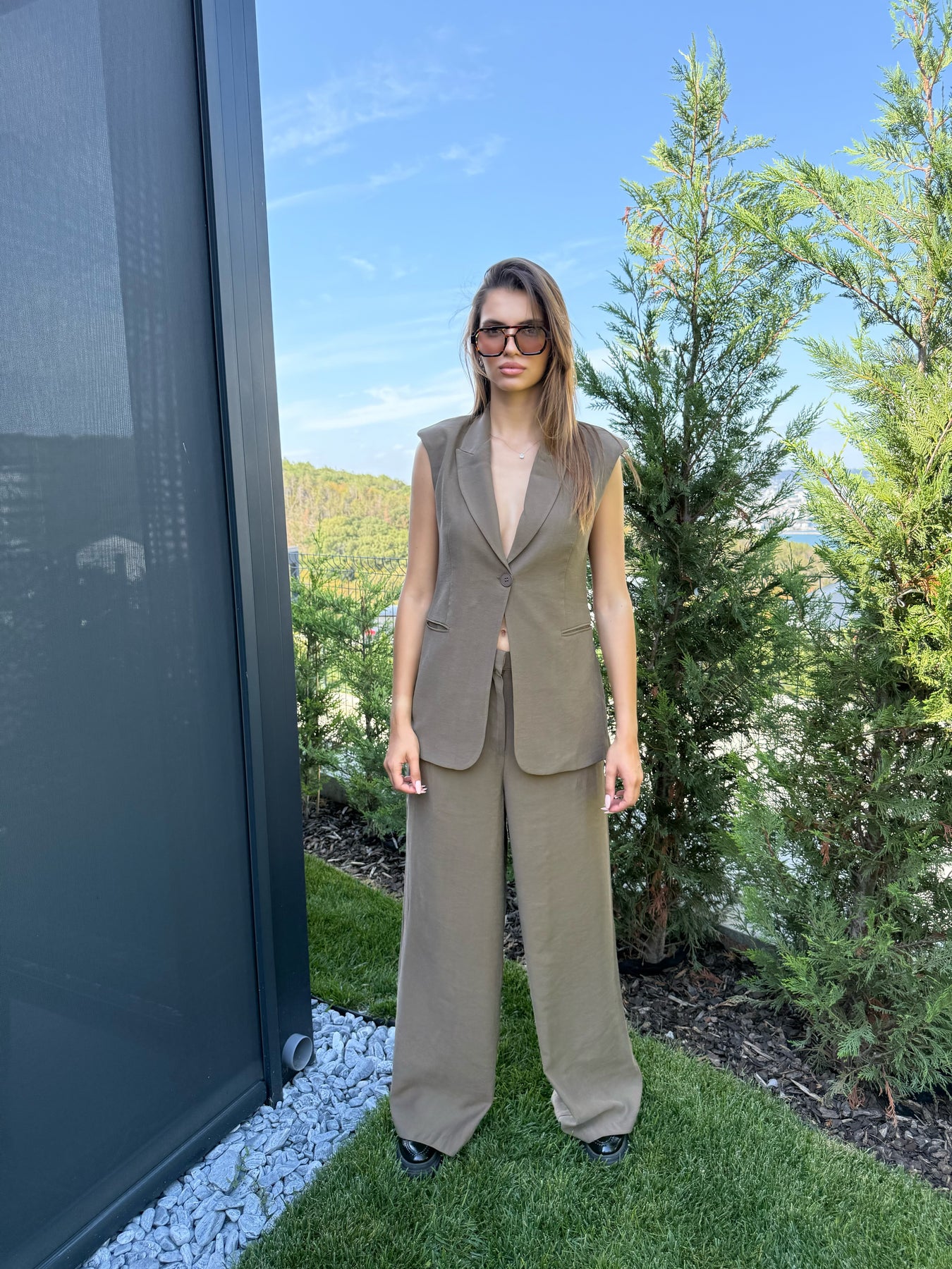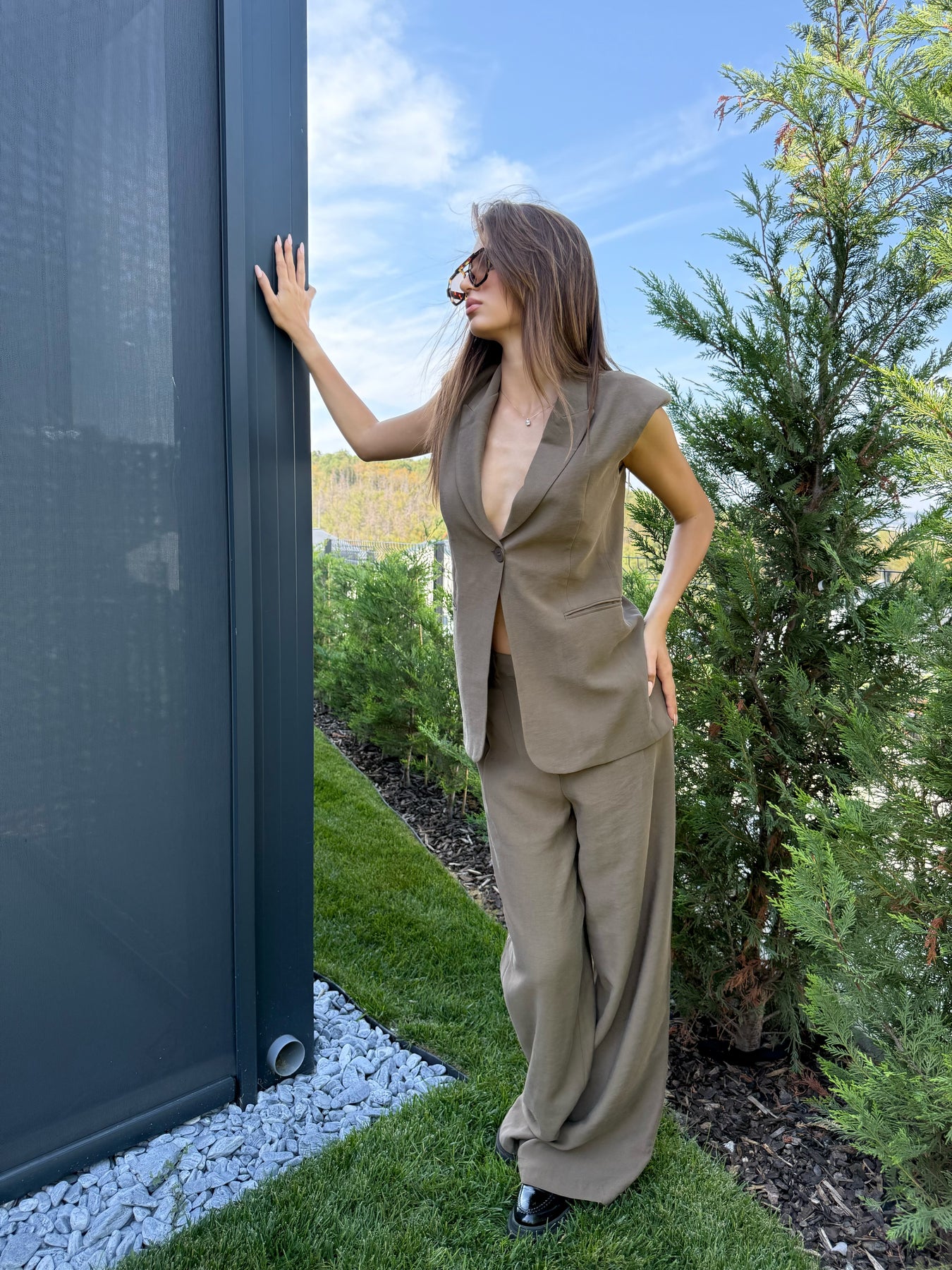 Този стилен комплект в светло зелен  цвят е създаден за жената, която иска да впечатлява с модерен и едновременно изчистен силует. Вталеният елек с дълбоко деколте и елегантно закопчаване придава изисканост, а широкият панталон с висока талия осигурява лекота и комфорт през целия ден. Универсалният цвят позволява безброй комбинации – от офис облекло до шикозни визии за вечерни събития.