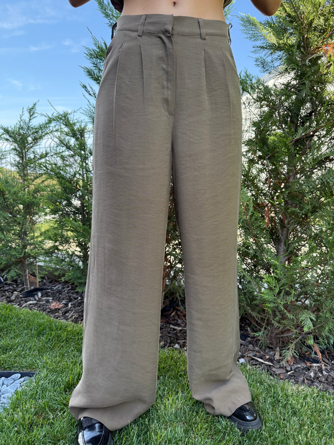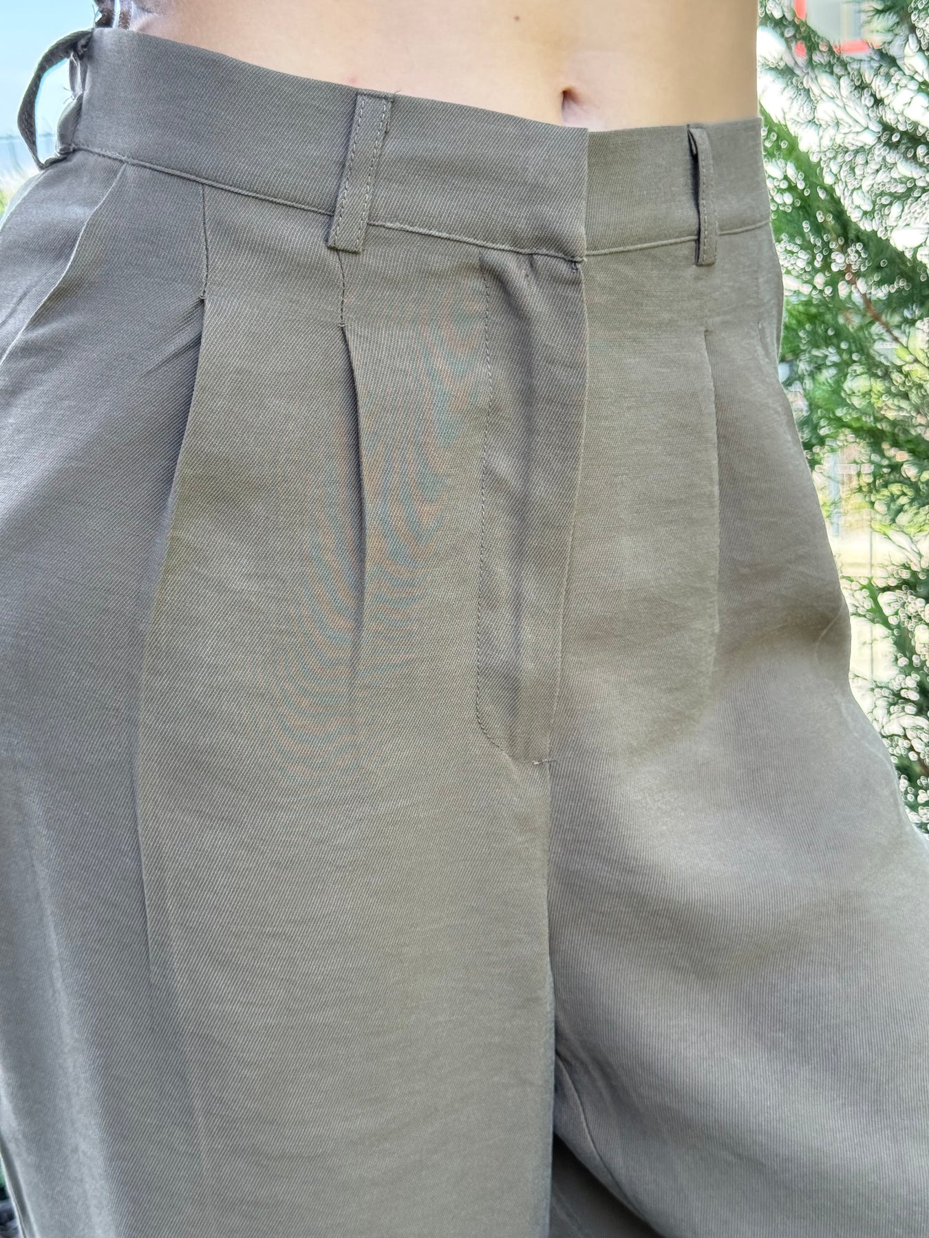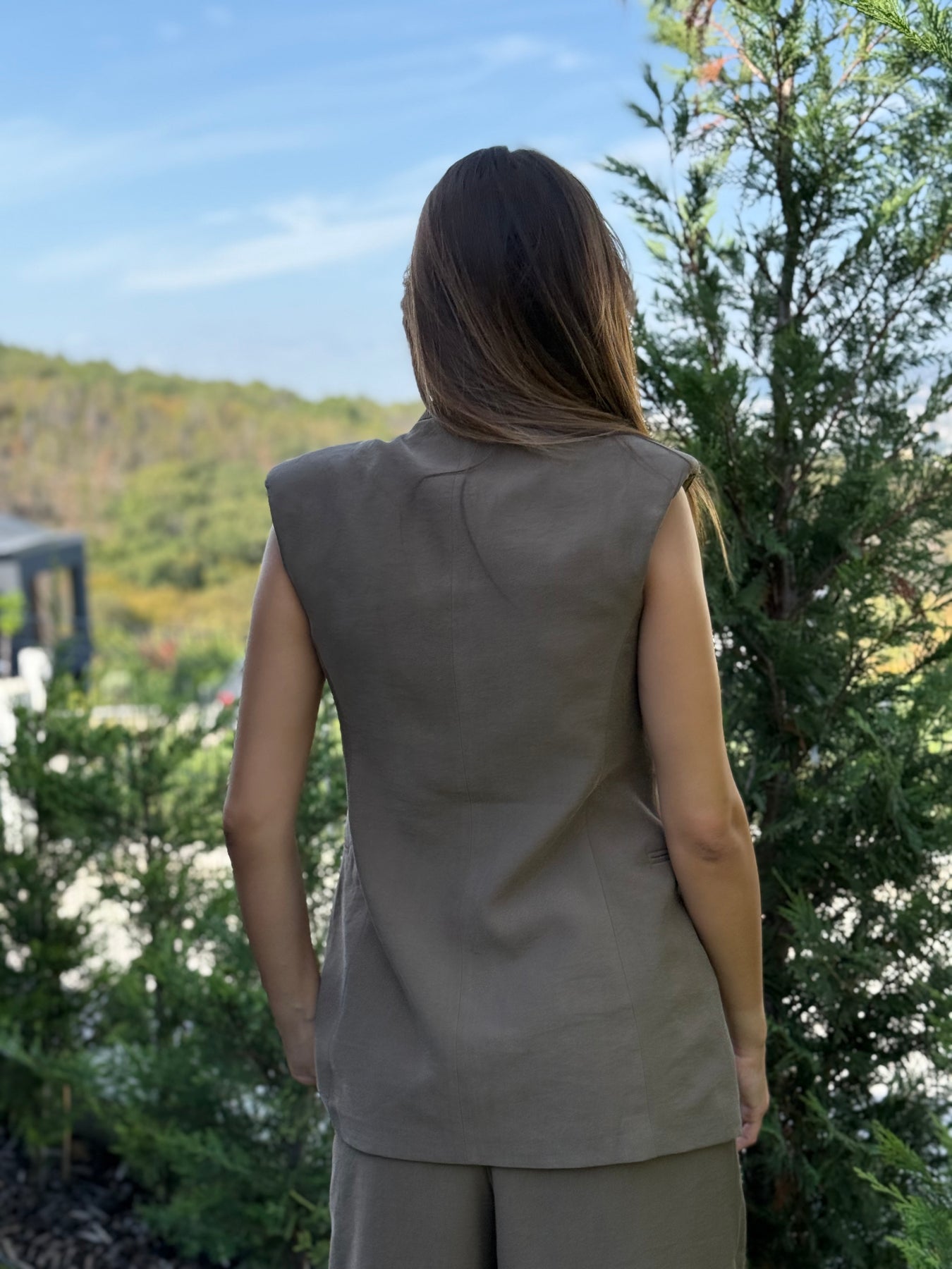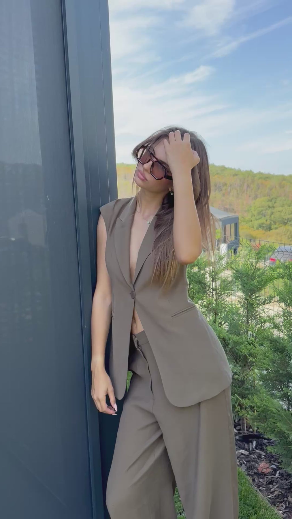 Този стилен комплект в светло зелен  цвят е създаден за жената, която иска да впечатлява с модерен и едновременно изчистен силует. Вталеният елек с дълбоко деколте и елегантно закопчаване придава изисканост, а широкият панталон с висока талия осигурява лекота и комфорт през целия ден. Универсалният цвят позволява безброй комбинации – от офис облекло до шикозни визии за вечерни събития.