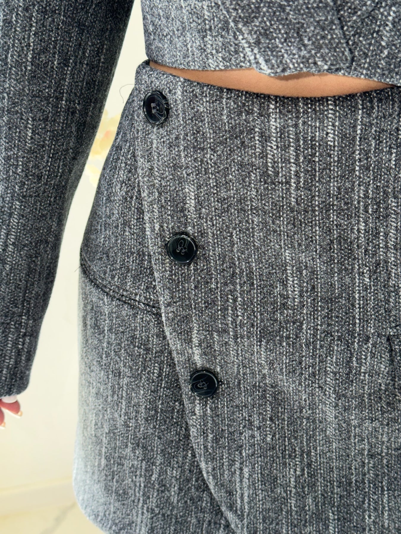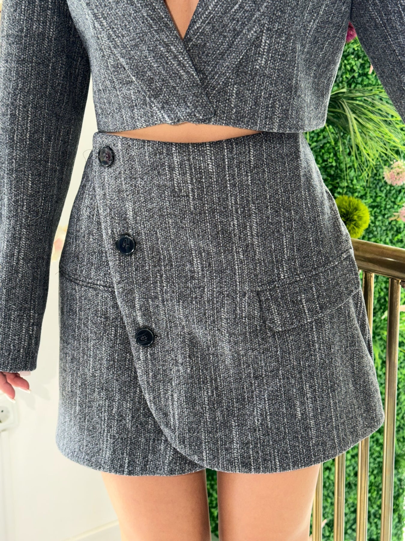 Този елегантен комплект от сако и пола е създаден за жената, която иска да изглежда уверена и модерна във всяка ситуация. Късото сако с подчертани рамене и полата с асиметрично закопчаване създават изчистена, но силно въздействаща визия. Фините райета добавят бизнес нюанс, а женствената кройка внася баланс между сила и елегантност.