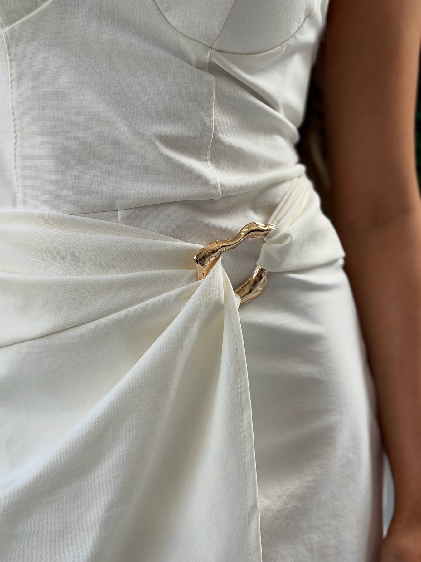 Драпираният дизайн с акцентна катарама в предната част създава илюзия за пола и подчертава талията, превръщайки модела в перфектен избор за специални поводи, събития или стилни излизания.
