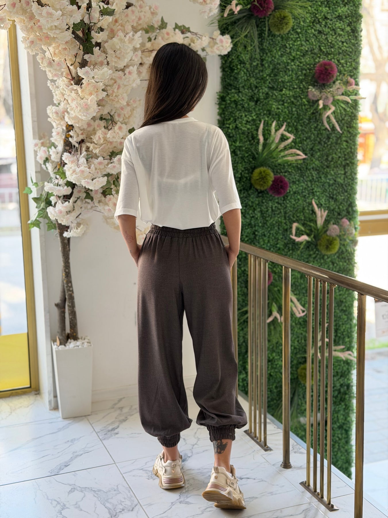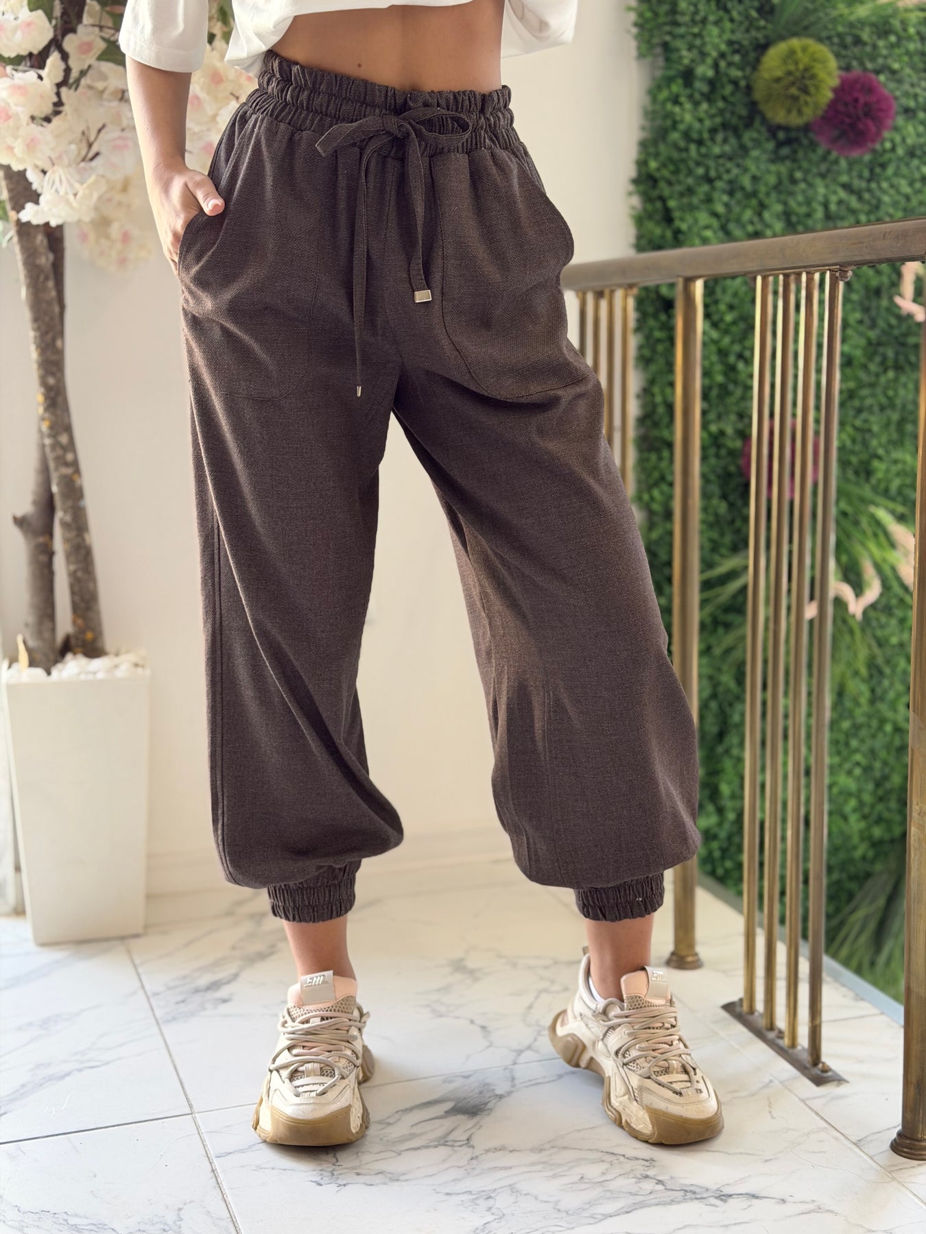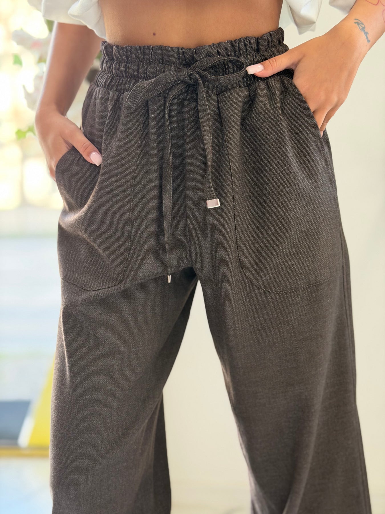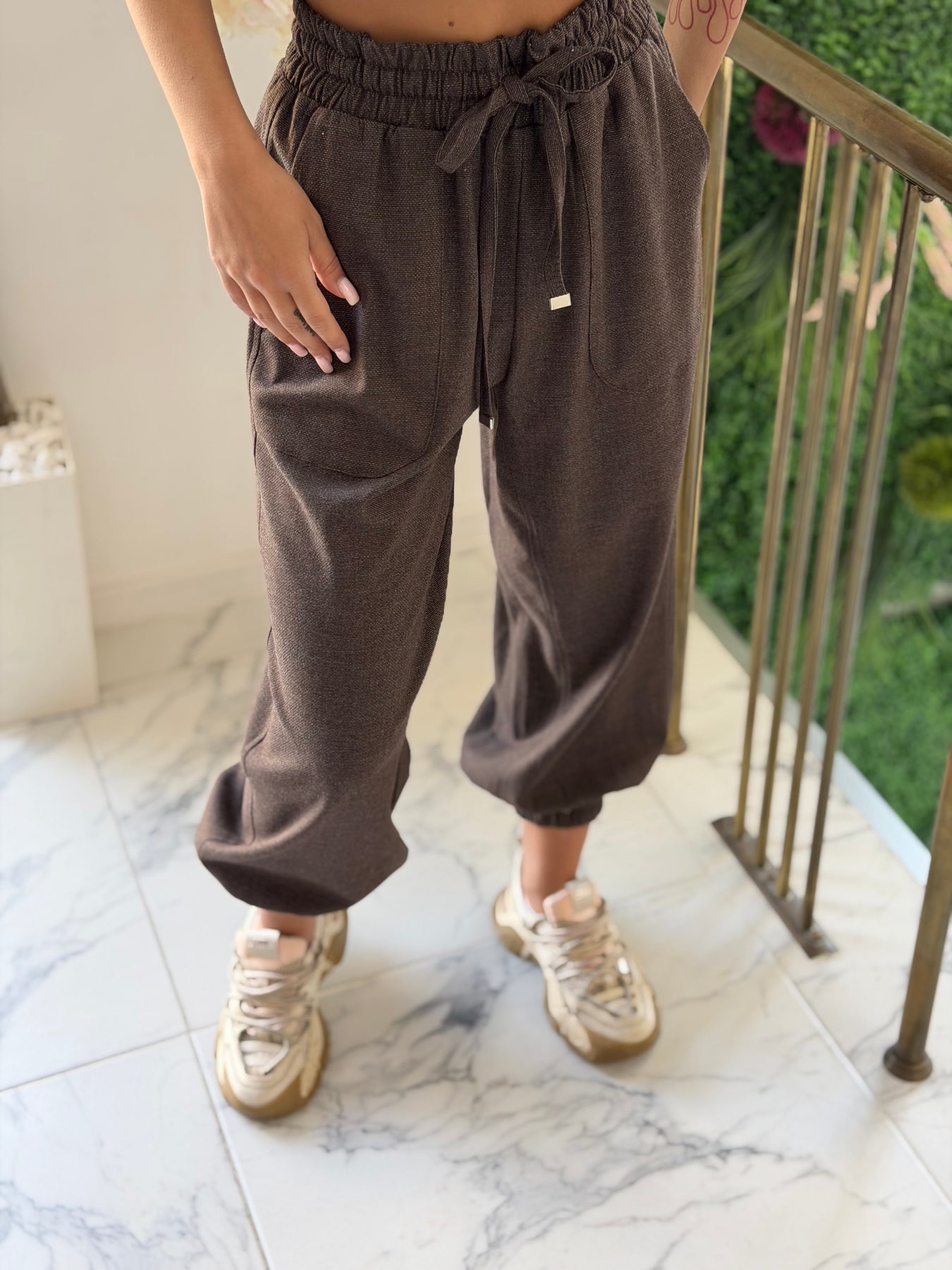 Елегантен панталон с еластична талия и връзки, който съчетава комфорт и модерен силует. Свободната кройка и стеснените крачоли придават спортно-елегантно излъчване, подходящо както за ежедневни визии, така и за по-стилни комбинации.