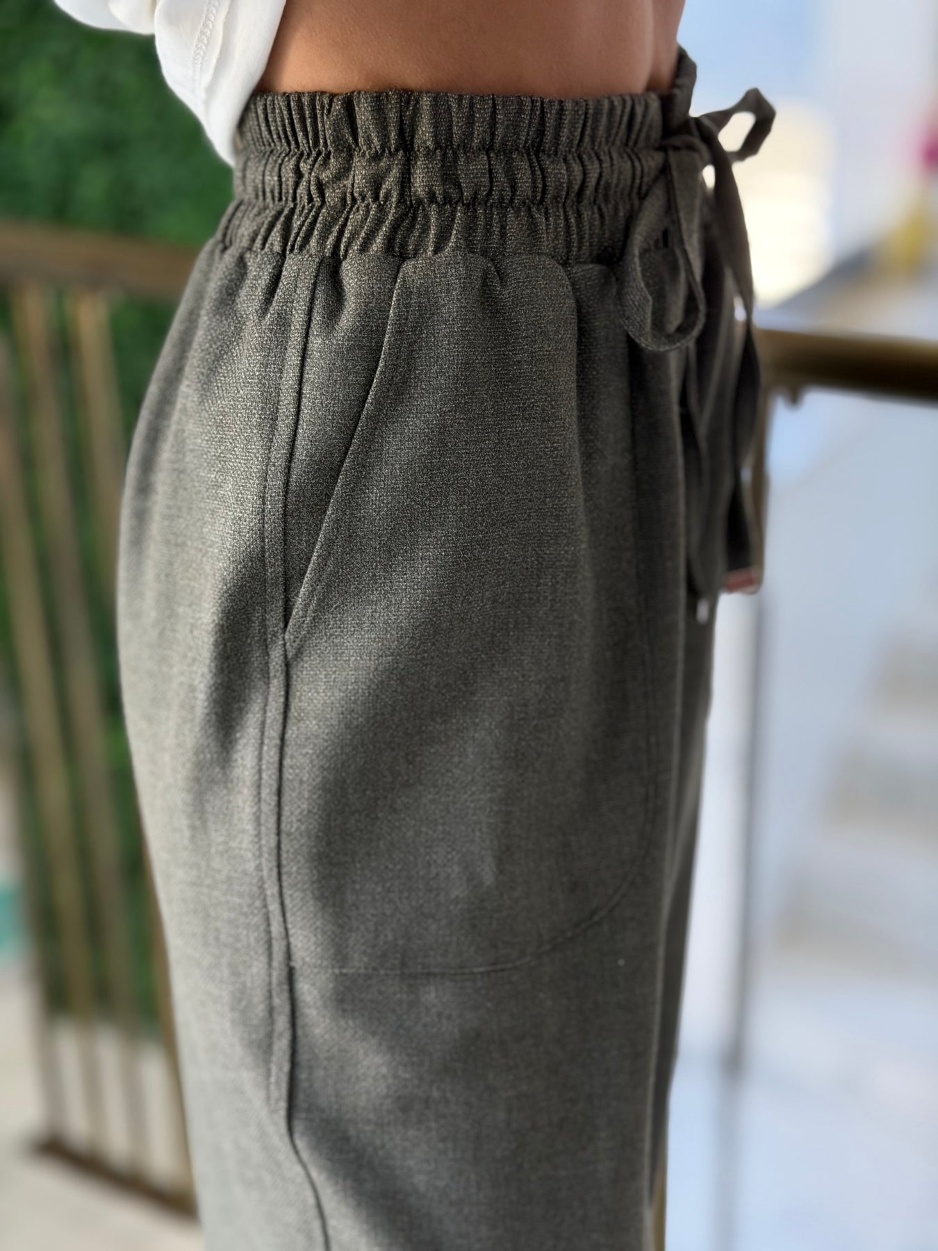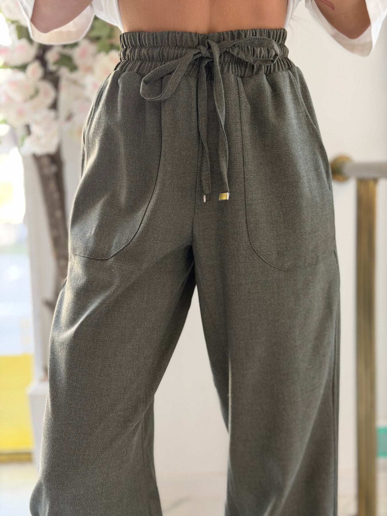 Елегантен панталон с еластична талия и връзки, който съчетава комфорт и модерен силует. Свободната кройка и стеснените крачоли придават спортно-елегантно излъчване, подходящо както за ежедневни визии, така и за по-стилни комбинации.