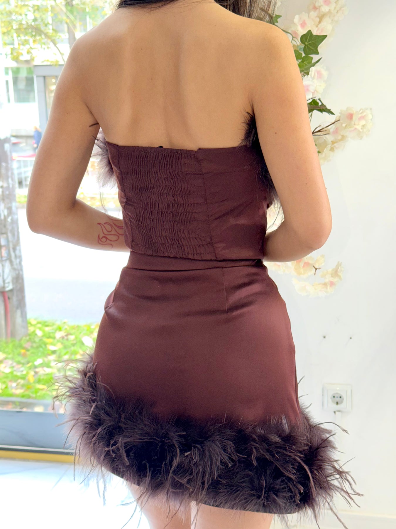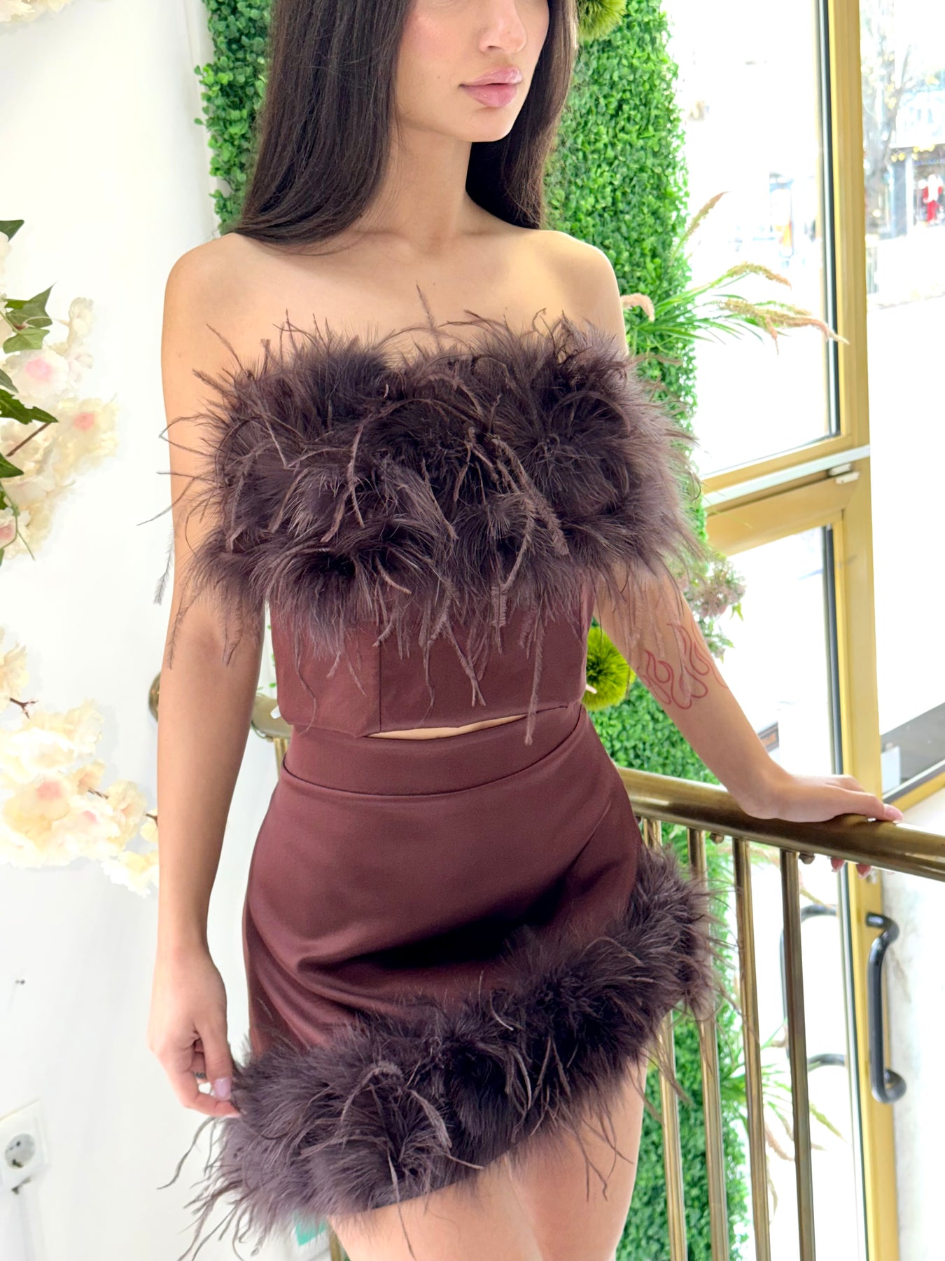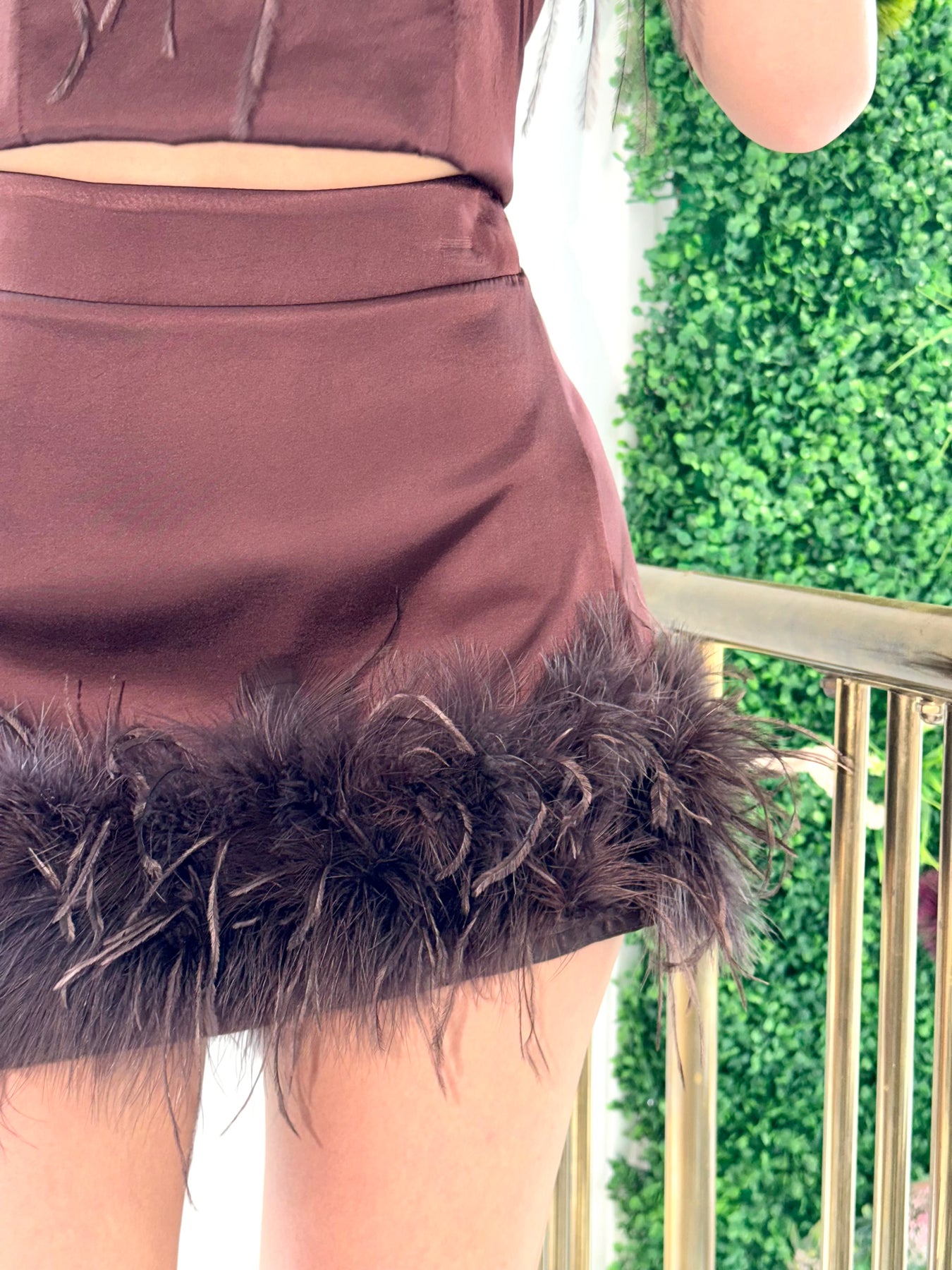Стилна мини пола с висока талия и ефектен завършек от пера за впечатляваща и модерна визия. Меката, гладка материя пада красиво по тялото, а декоративните пера придават лукс и движение. Перфектен избор за вечерни излизания, партита и специални поводи.