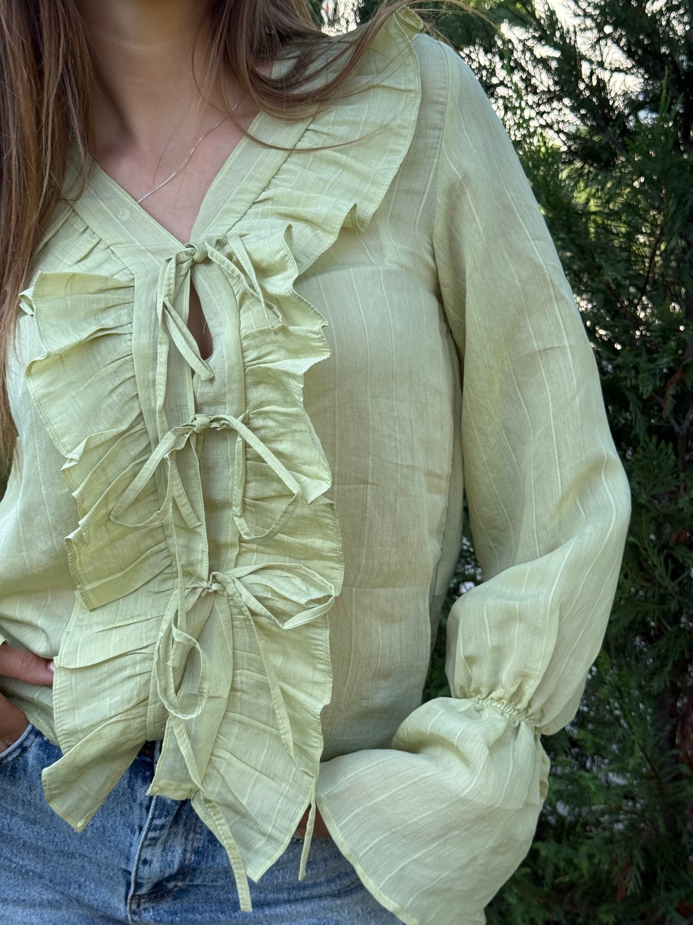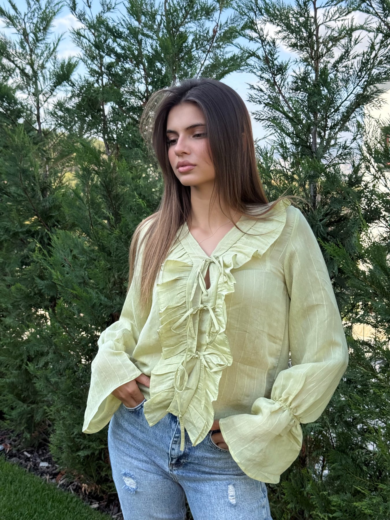 • Детайли: Къдрици и декоративни връзки отпред, леко разкроени ръкави