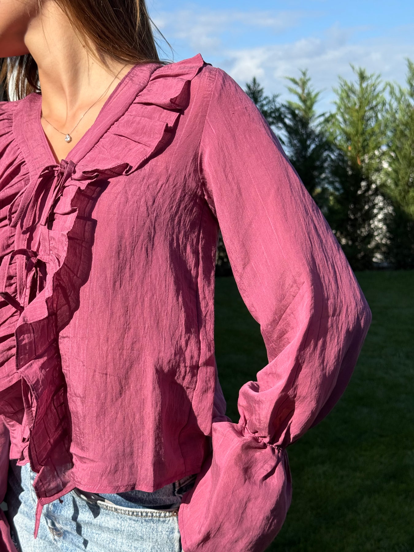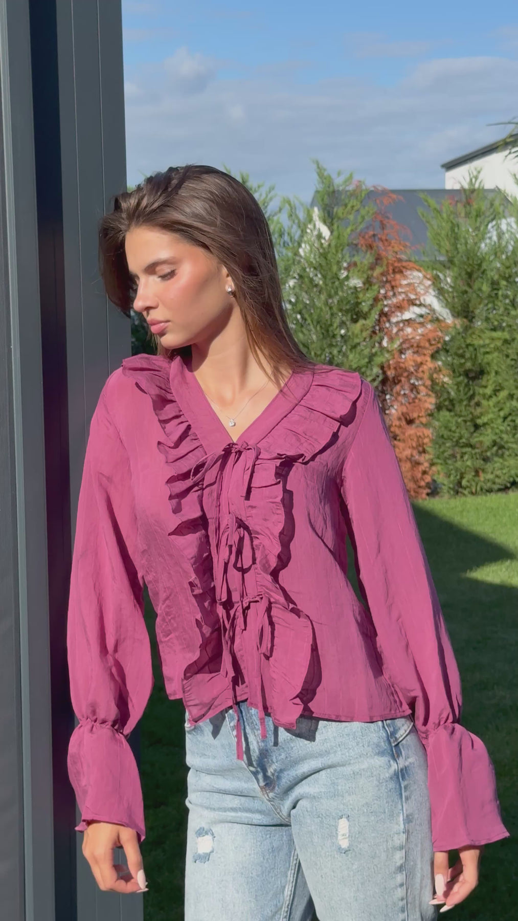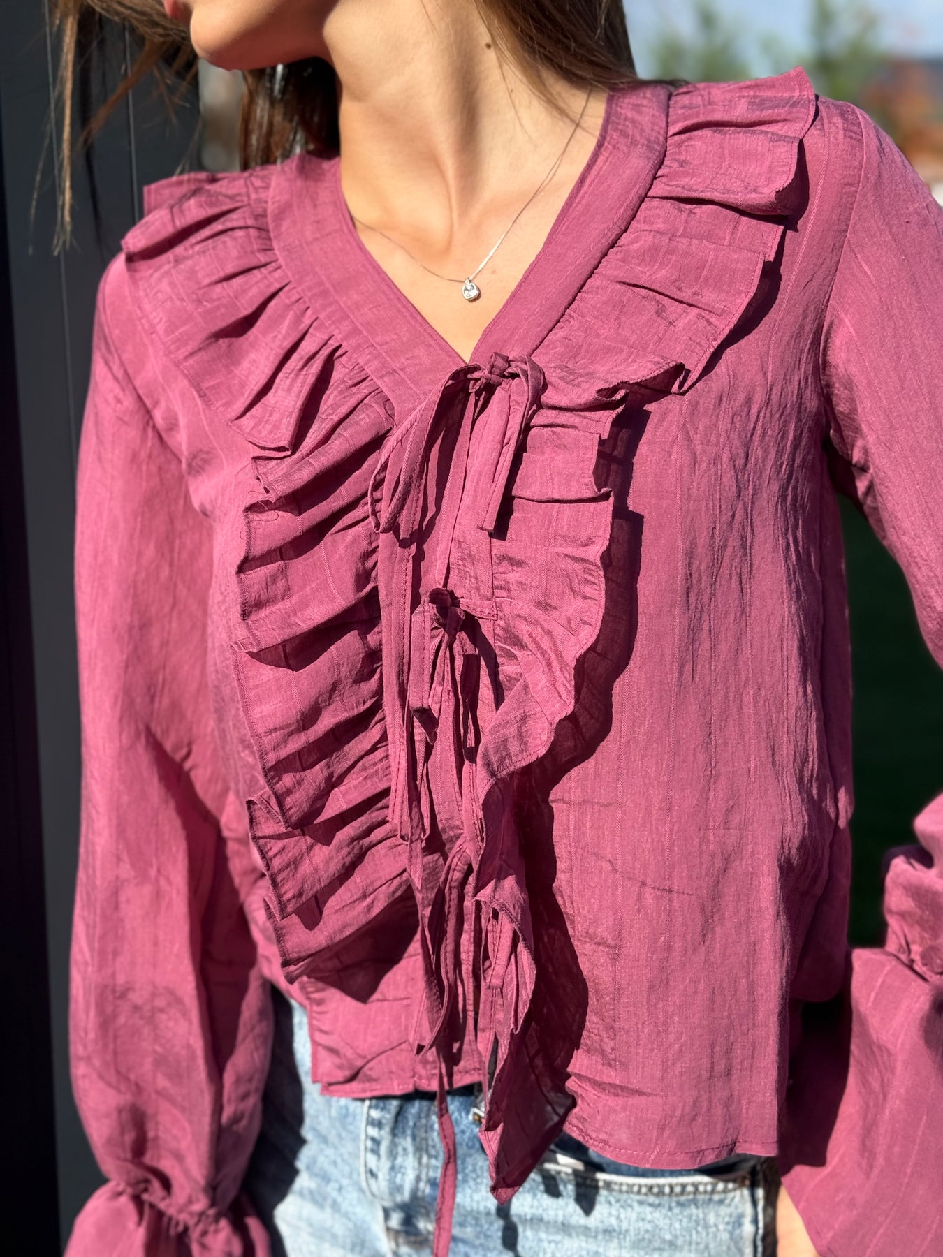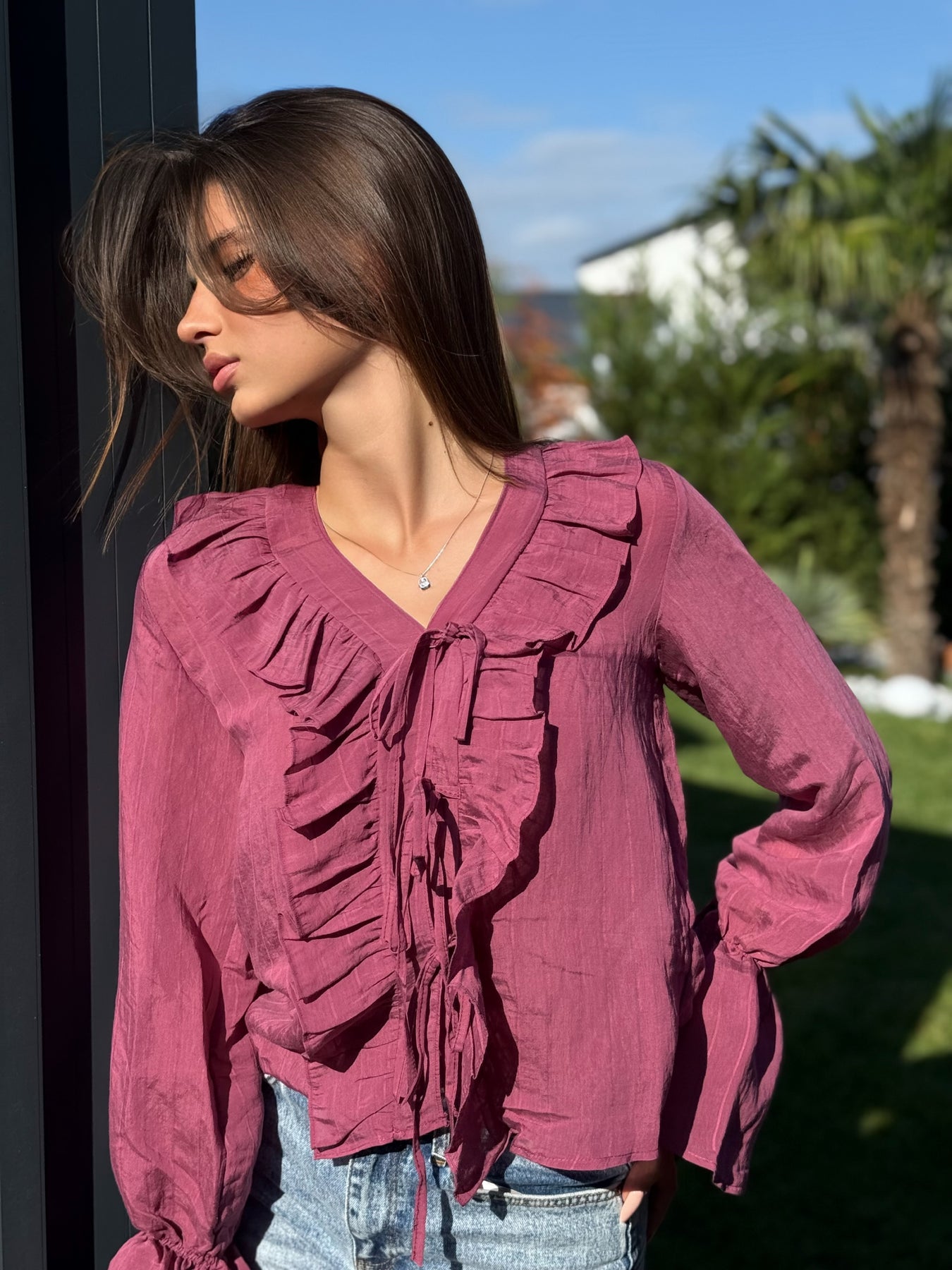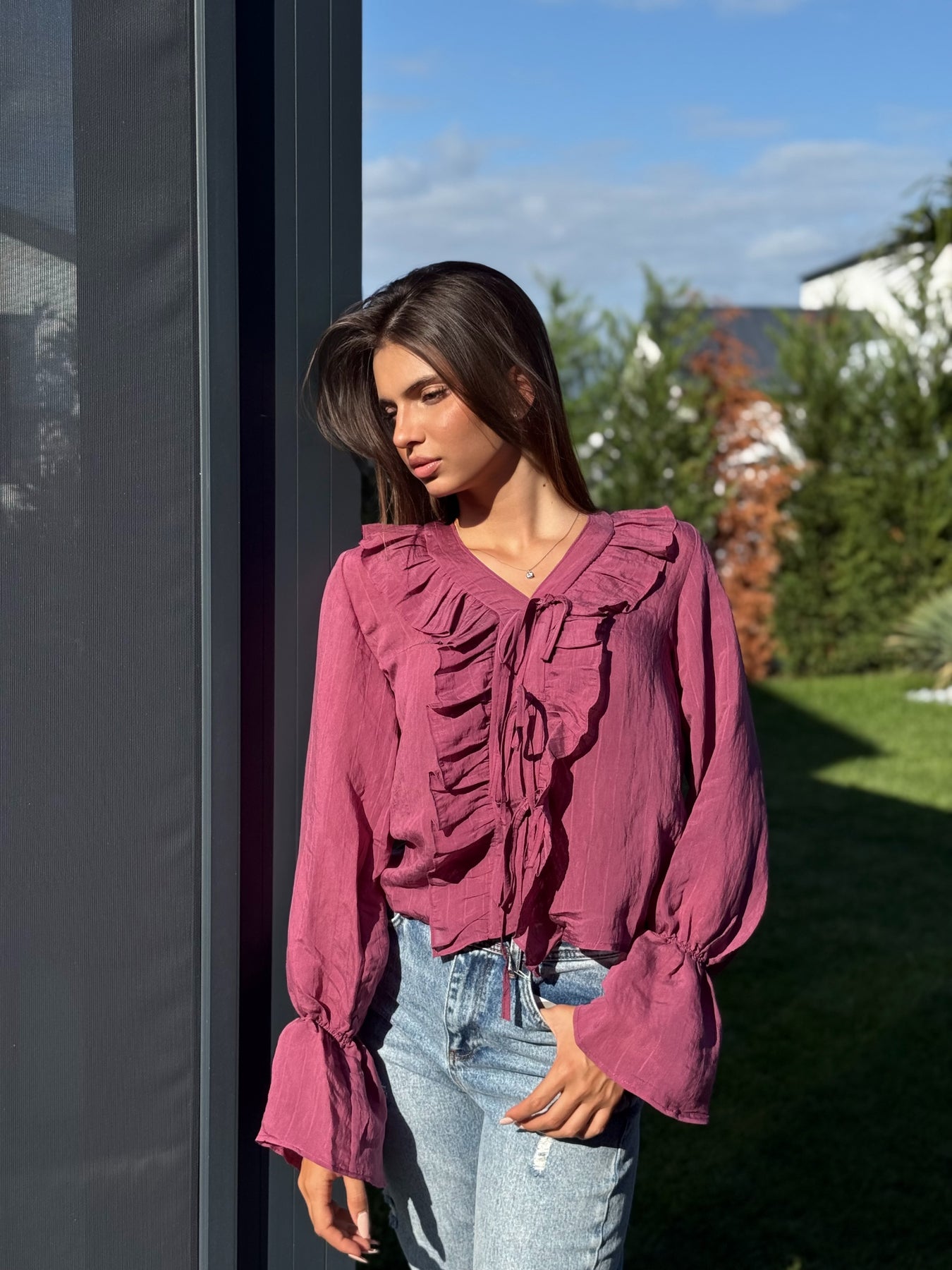 Риза , която съчетава романтика и бохо чар. Изработена от лека и ефирна материя, тя е идеална за топлите дни, като носи усещане за свобода и женственост. Декоративните къдрици и връзки отпред добавят динамика и придават закачливо излъчване, а свободната кройка я прави удобна за носене през целия ден.
