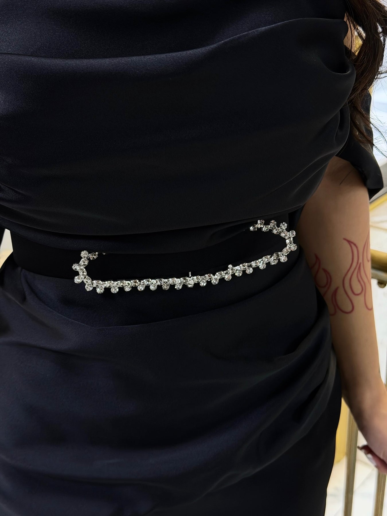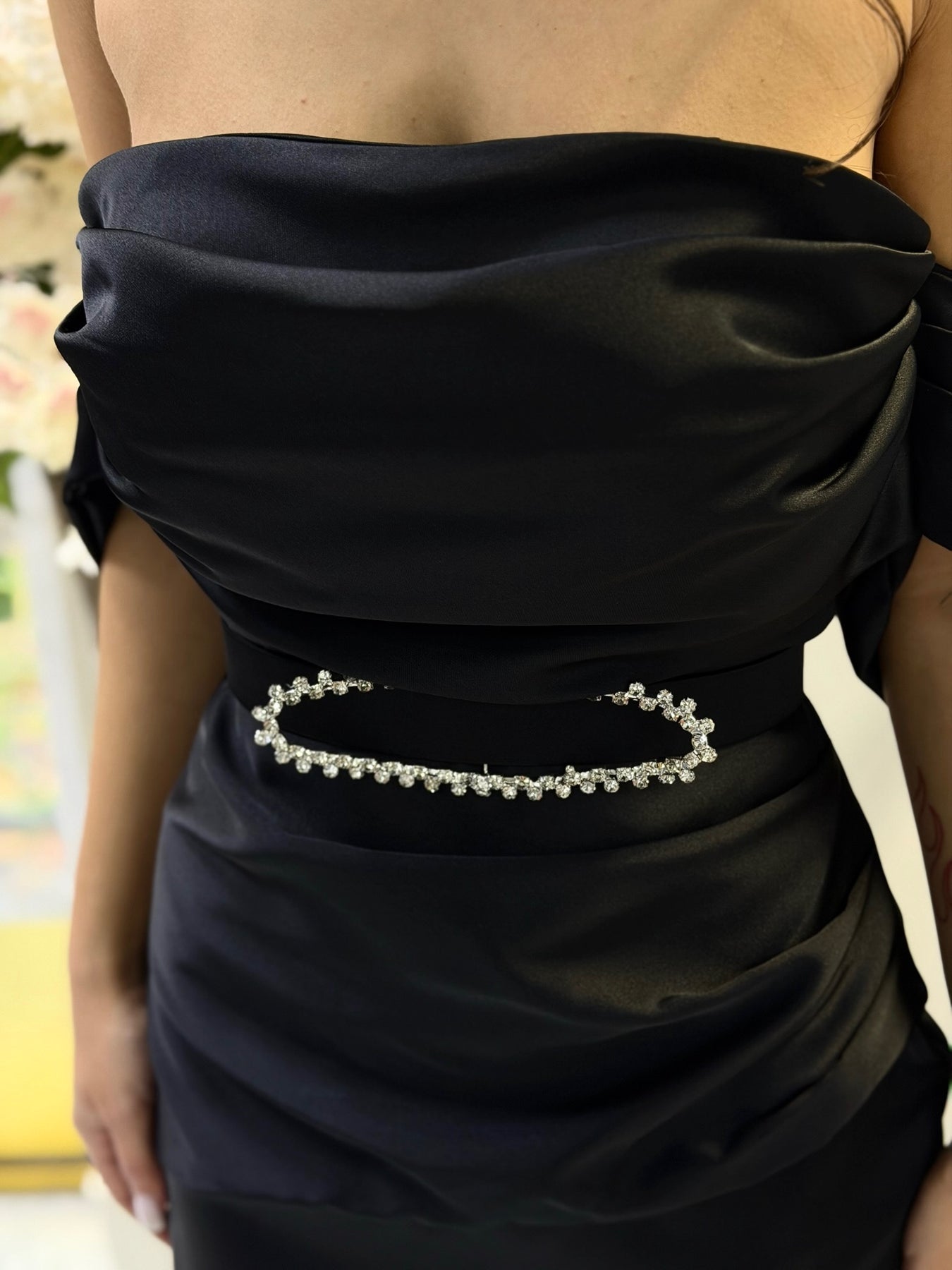 Тази черна елегантна рокля е създадена за жената, която умее да впечатлява с класа и финес. Силуетът подчертава извивките, а падащите рамене и деликатно драпираният бюст придават женственост и загадъчност. Фината сатенена материя нежно обгръща тялото, а декоративният колан с перлени детайли акцентира върху талията.