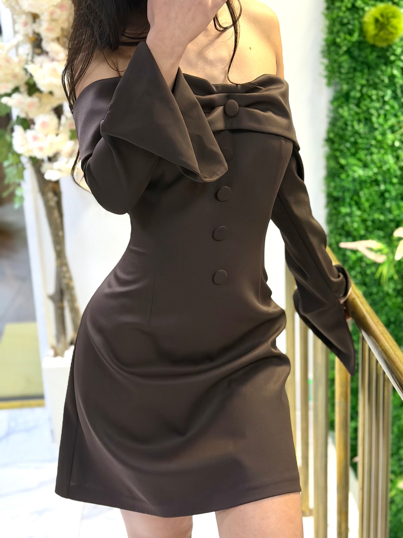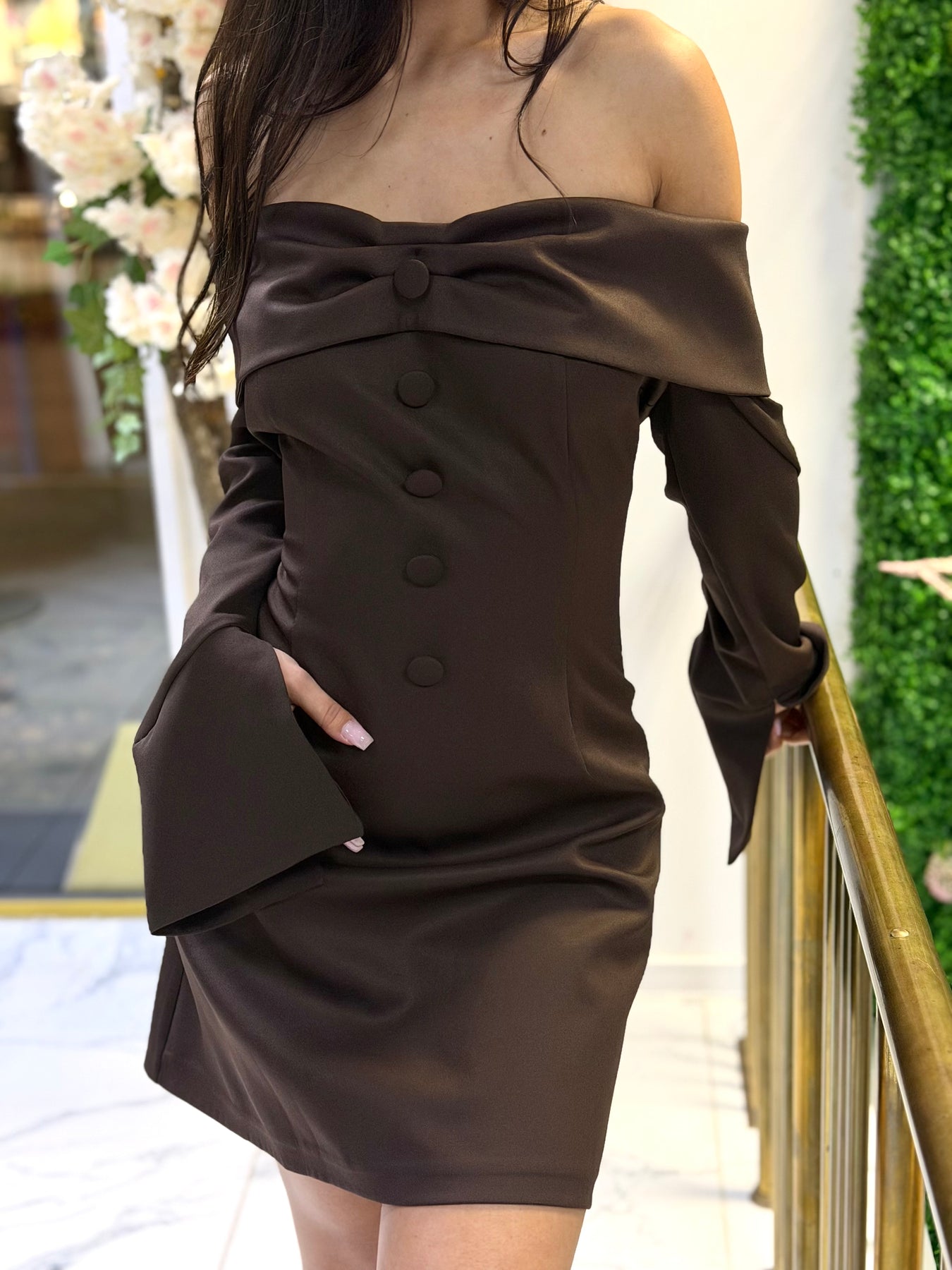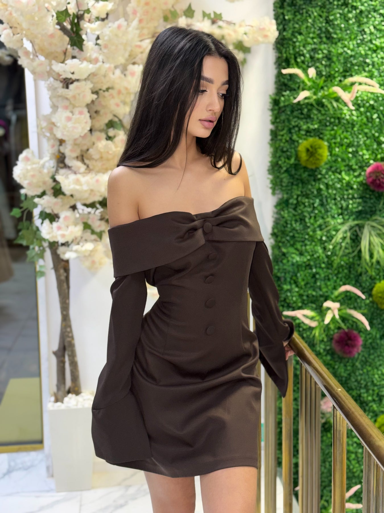 Тази елегантна рокля е създадена за жената, която обича да впечатлява с лекота. Моделът подчертава силуета с вталена кройка и изчистени линии, а откритите рамене и декоративната панделка придават изискан и женствен завършек. Меката, но структурирана материя осигурява комфорт през целия ден и вечер, а шоколадово кафявият нюанс добавя усещане за лукс и класа.
