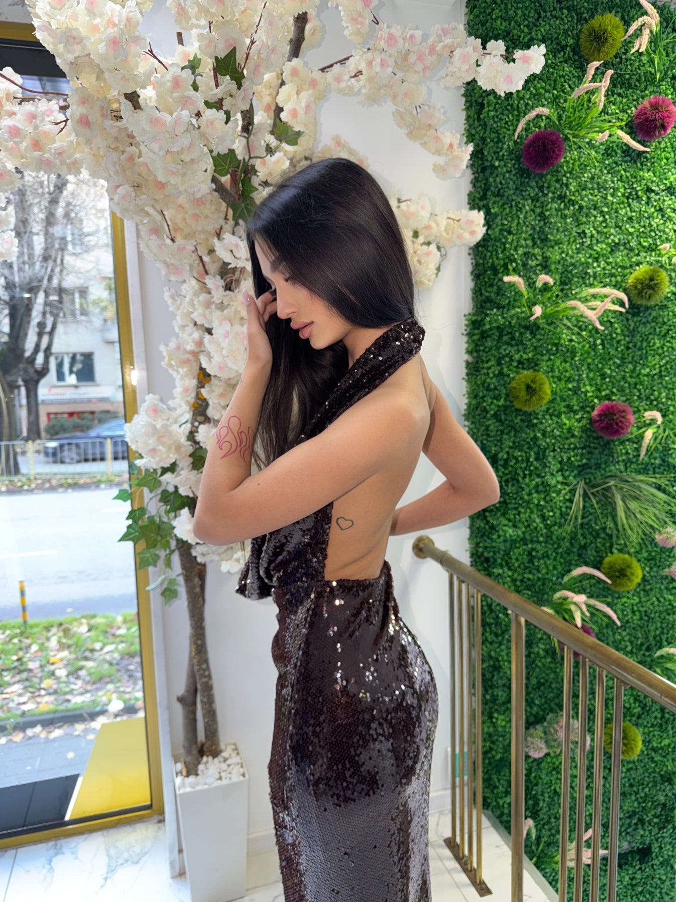 Тази зашеметяваща дълга рокля с пайети е създадена за жената, която обича да бъде в центъра на вниманието. Дълбокото V-деколте подчертава деколтето по елегантен начин, а изящната кройка по тялото оформя силуета и придава изключително женствено излъчване. Блестящата материя улавя светлината при всяко движение, създавайки луксозно и драматично присъствие.