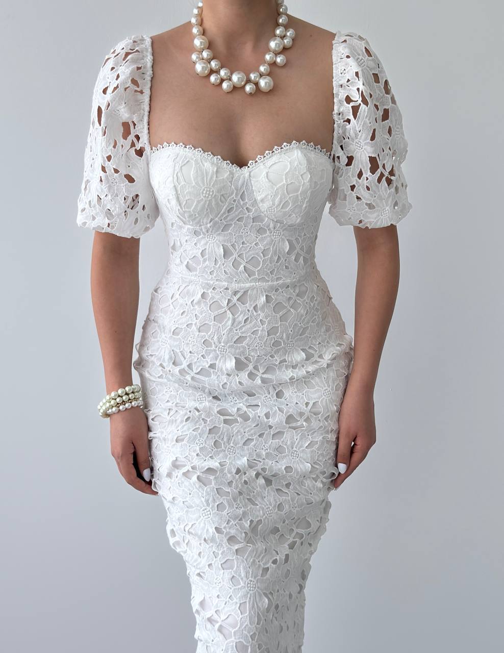 Детайли: Балон ръкави, сърцевидно деколте, нежна дантелена текстура