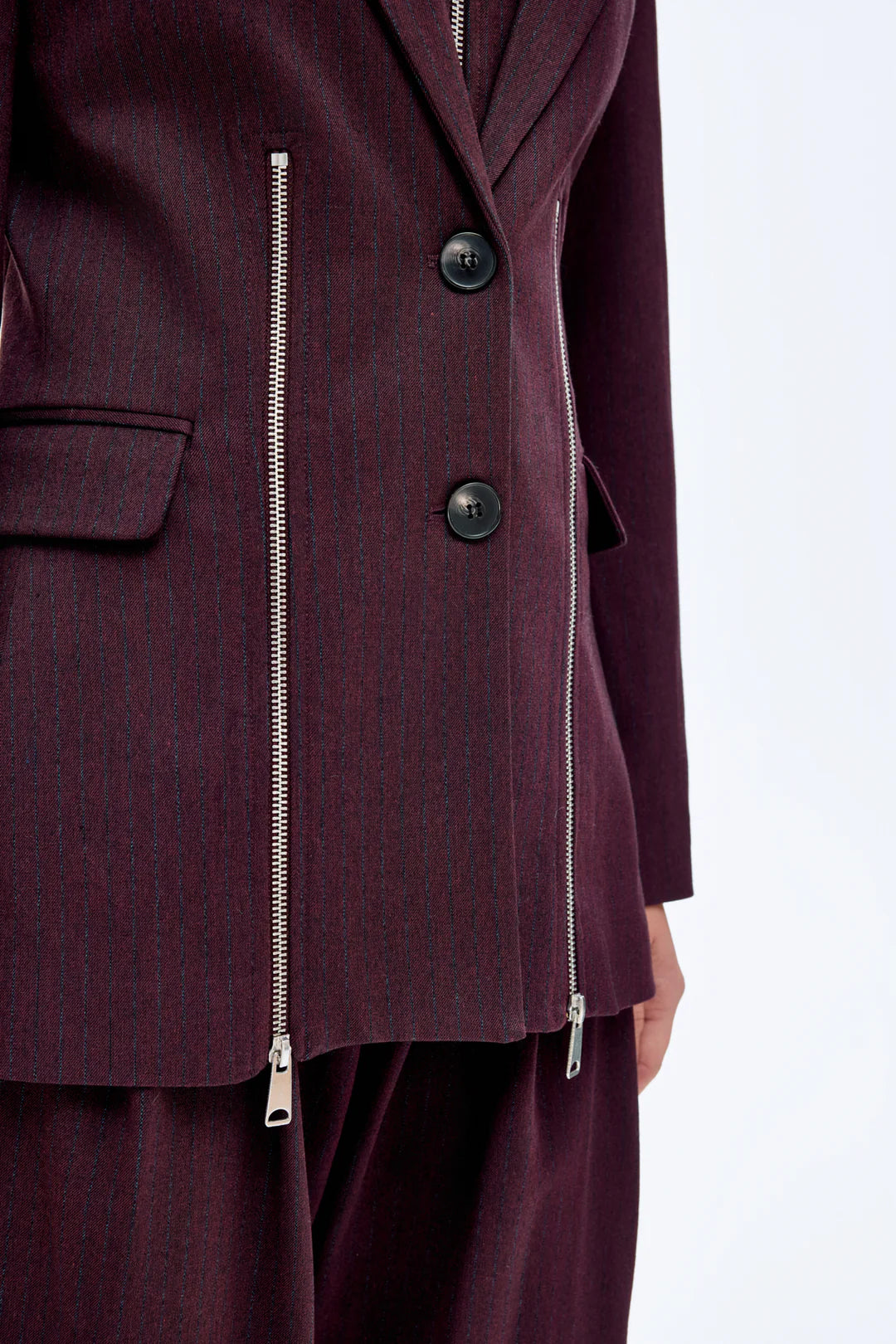 Това модерно сако е създадено за жената, която иска да комбинира класическа елегантност с дръзки детайли. Изработено в наситен бордо нюанс, то впечатлява с дълга линия и изчистен силует, допълнен от контрастни метални ципове, които придават модерен характер и уникалност. Подходящо е както за бизнес визии, така и за вечерни аутфити с индивидуален почерк.