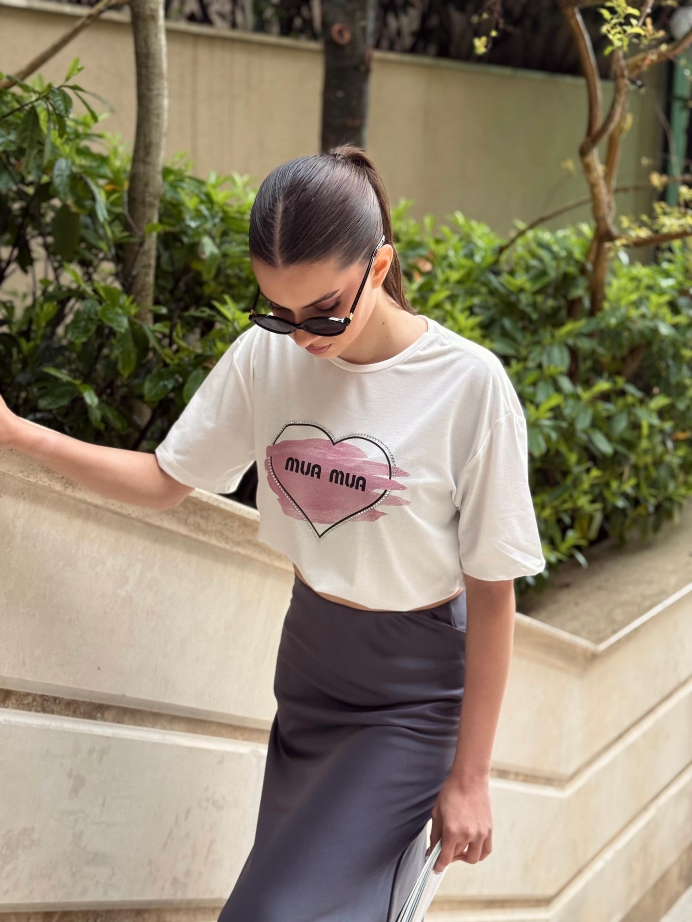 Тази стилна тениска е идеалният избор за момичета, които обичат да съчетават романтика и градски шик. Принт с розово сърце и надпис MUA MUA я прави акцент във всяка визия – перфектна за дънки, поли или къси панталони.