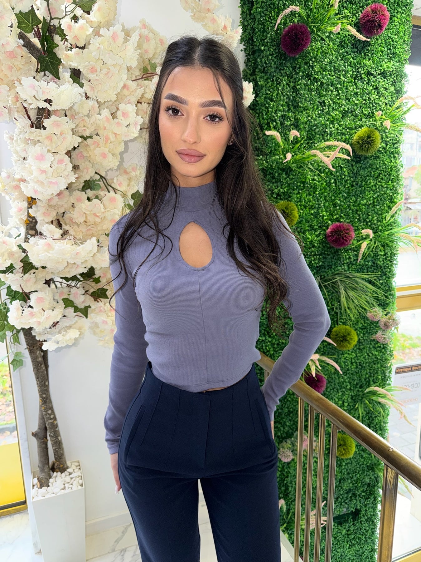Тази елегантна блуза с изрязано деколте е перфектният избор за жената, която обича да съчетава класиката с модерен акцент. Вталената кройка подчертава силуета, а фината еластична материя осигурява комфорт и свобода на движение. Семплата визия е допълнена от деликатен отвор в горната част – детайл, който добавя женственост и стил.