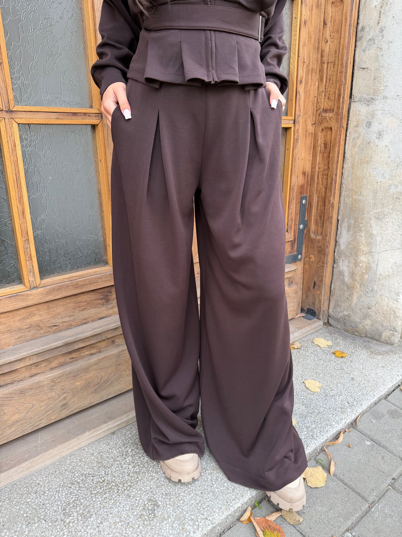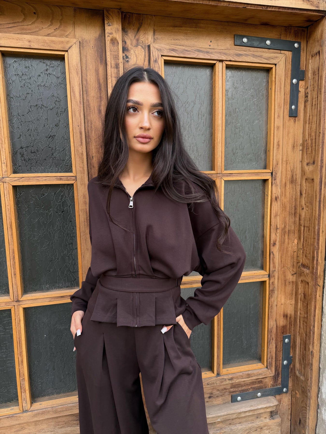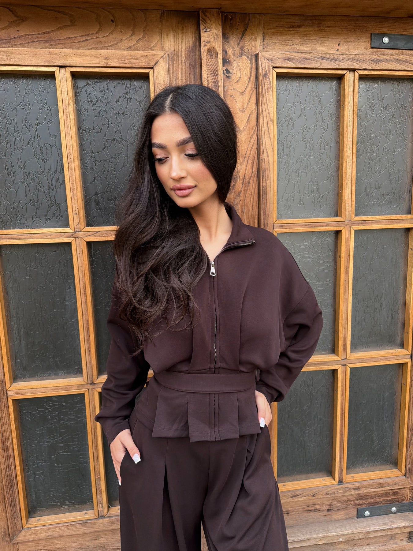 Този модерeн двоен комплект е създаден за жената, която обича съчетанието между комфорт и изискан стил. Меката, но структурирана материя придава елегантно падане, а широкият панталон с висока талия издължава силуета. Горнището с цип и еластичен колан оформя талията и позволява да се носи както свободно, така и прибрано за по-женствена визия.